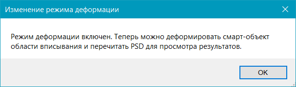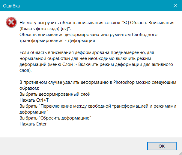 Если деформировать смарт-объект области вписывания без активного режима деформации, то при попытке перечитать PSD Конструктор покажет следующее сообщение об ошибке: