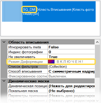 Перечитайте PSD-файл. Индикатором активированного режима является префикс SQ_DM, FSQ_DM, FSQR_DM в названии слоя области вписывания. Также в параметрах выбранного слоя напротив параметра будет указан статус .