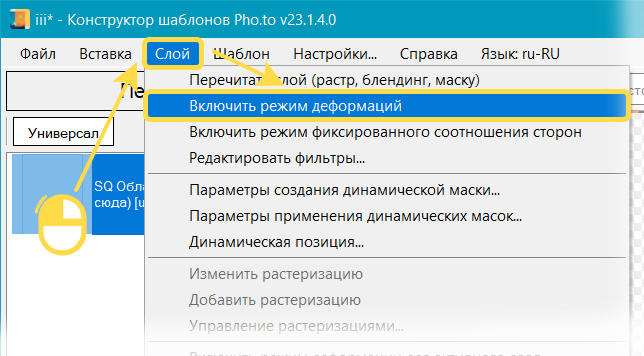 Для включения режима деформаций выберите область вписывания в списке слоев Конструктора шаблонов, а затем в меню нажмите .