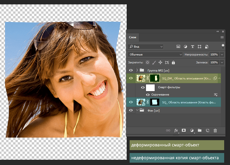 Для деформации смарт-объекта области вписывания в Photoshop можно использовать режим Свободного трансформирования (Ctrl+T), режим Марионеточной деформации, а также различные смарт-фильтры, которые сдвигают пиксели.