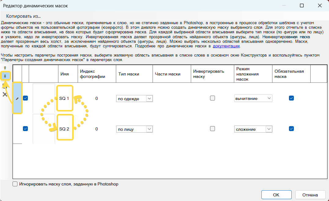 При изменении порядка источников относительно порядка областей вписывания в PSD, при повторном открытии в нижней части окна появится предупреждение: "Внимание! Порядок слоев в списке отличается от порядка в PSD (из-за заданных параметров маски)! Убедитесь, что меняете параметры для того слоя, что вам нужен.". Это сообщение носит информационный характер и указывает на возможное расхождение порядка элементов. Перед изменением параметров убедитесь, что выбран именно тот источник, для которого требуется настройка маски.