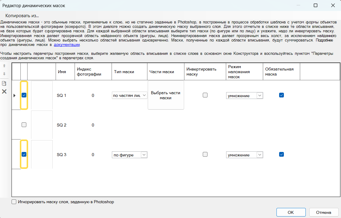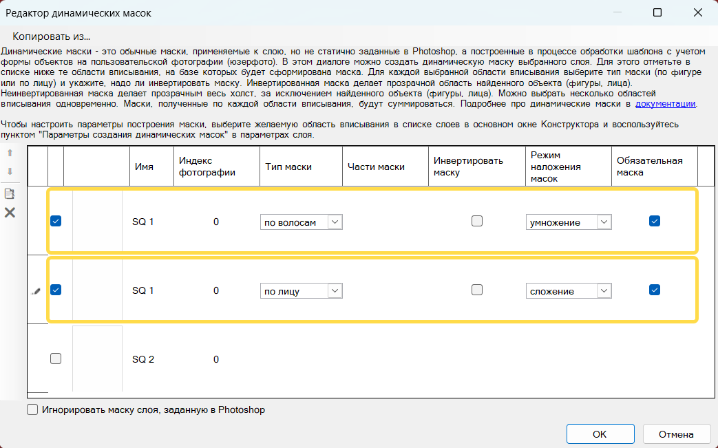 При добавлении маски для нее по-умолчанию устанавливается галочка в колонке . Однако, для маски галочка в колонке не ставится автоматически, и маска остается необязательной. Это позволяет корректно обрабатывать фотографии людей без волос. В случае необходимости, вы всегда можете вручную установить галочку в колонке .