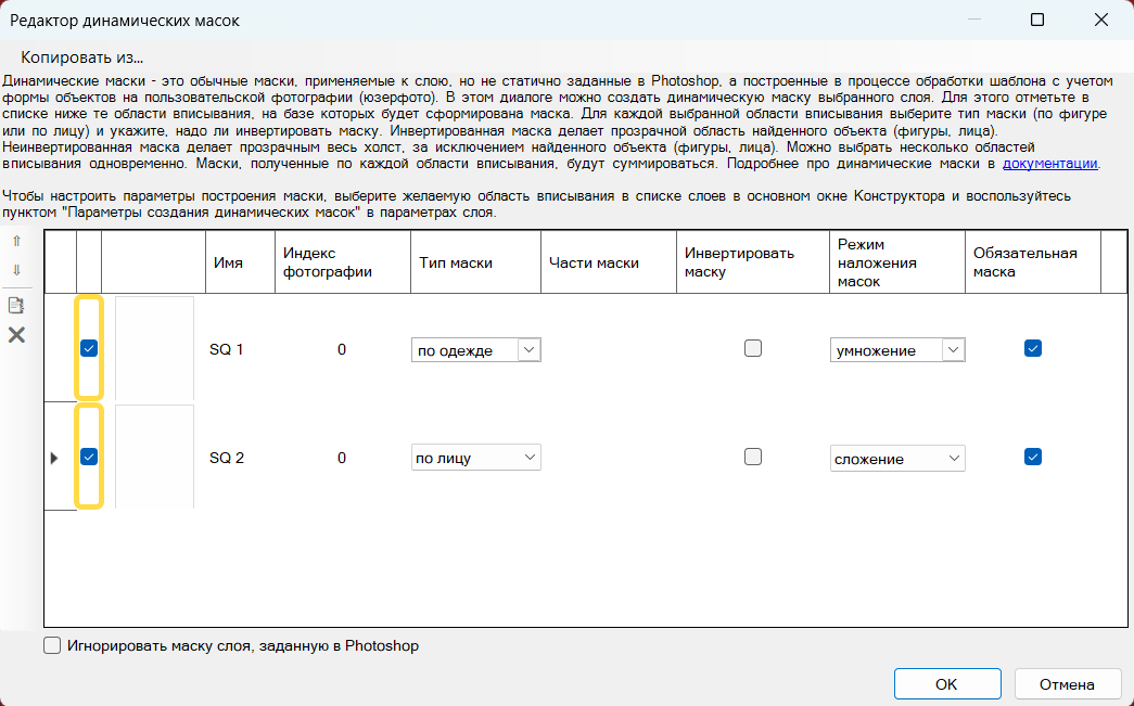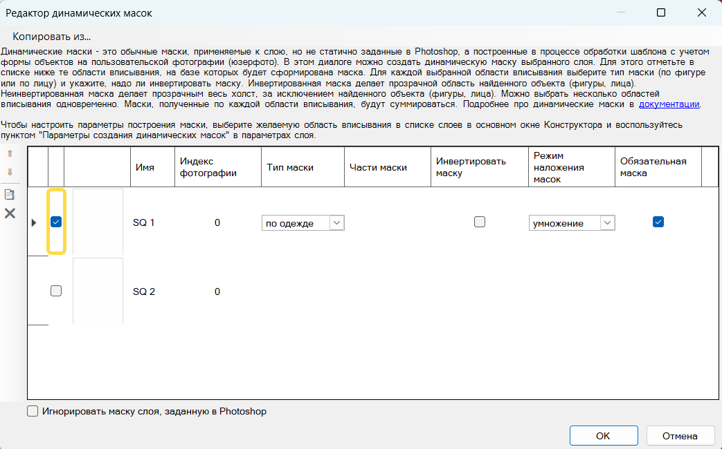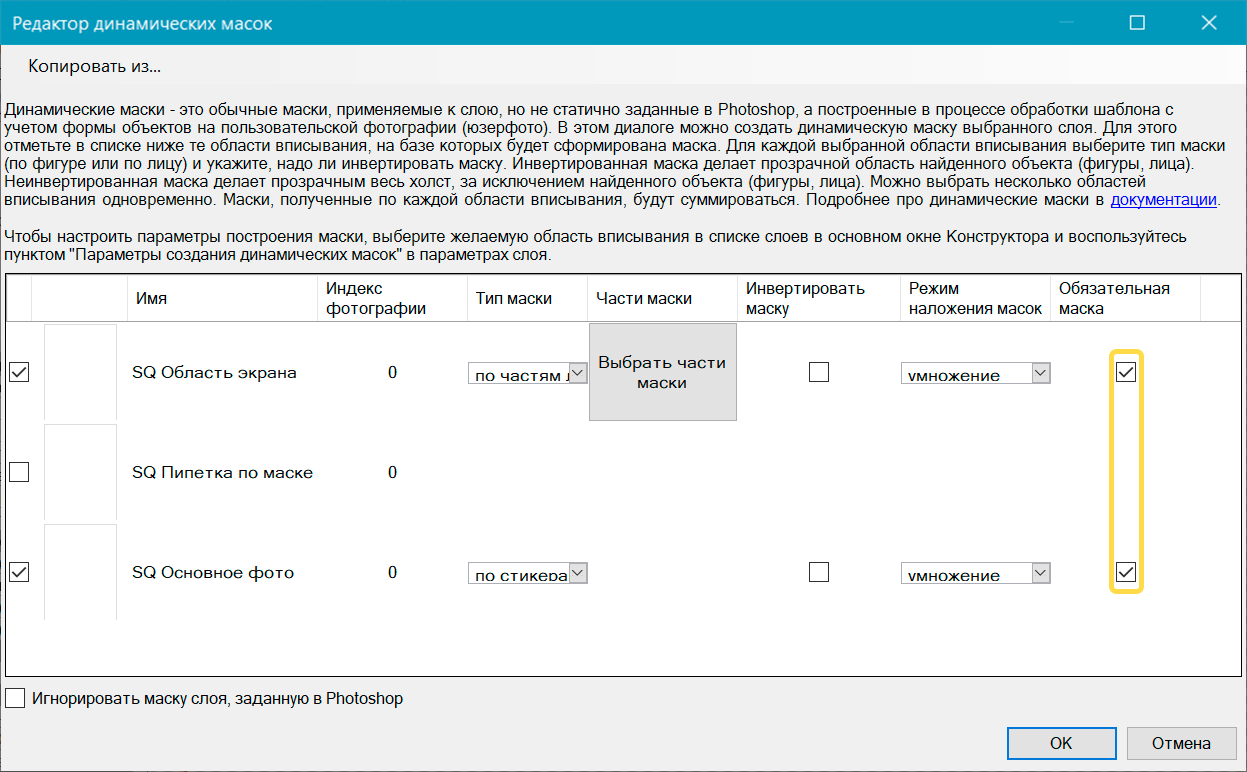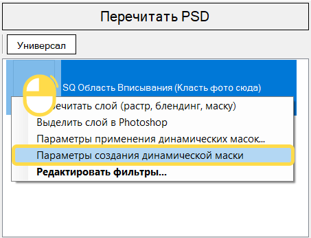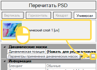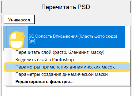 — выключает маску, имеющуюся в PSD-документе для слоя, к которому будет применяться динамическая маска. Это может быть удобно для выключения тестовой маски, нарисованной в Photoshop для прикидки конечного результата.