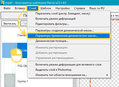 Для маски по стикерам параметры недоступны. Она строится по стикеру в Photoshop и в соответствии с позицией, заданной фильтром Растеризация.