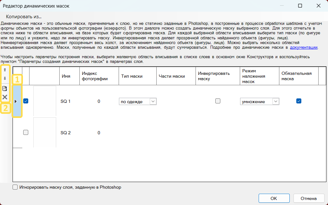 Если вы хотите использовать один источник для нескольких разных масок, вам необходимо продублировать его в . В Windows для этого щелкните по области слева от галочки выбора источника [1], а в MacOS — по любому свободному месту в строке источника. Затем используйте кнопки дополнительной панели для работы с источниками масок [2]. Панель расположена в левой части в Windows и в нижней части в MacOS.