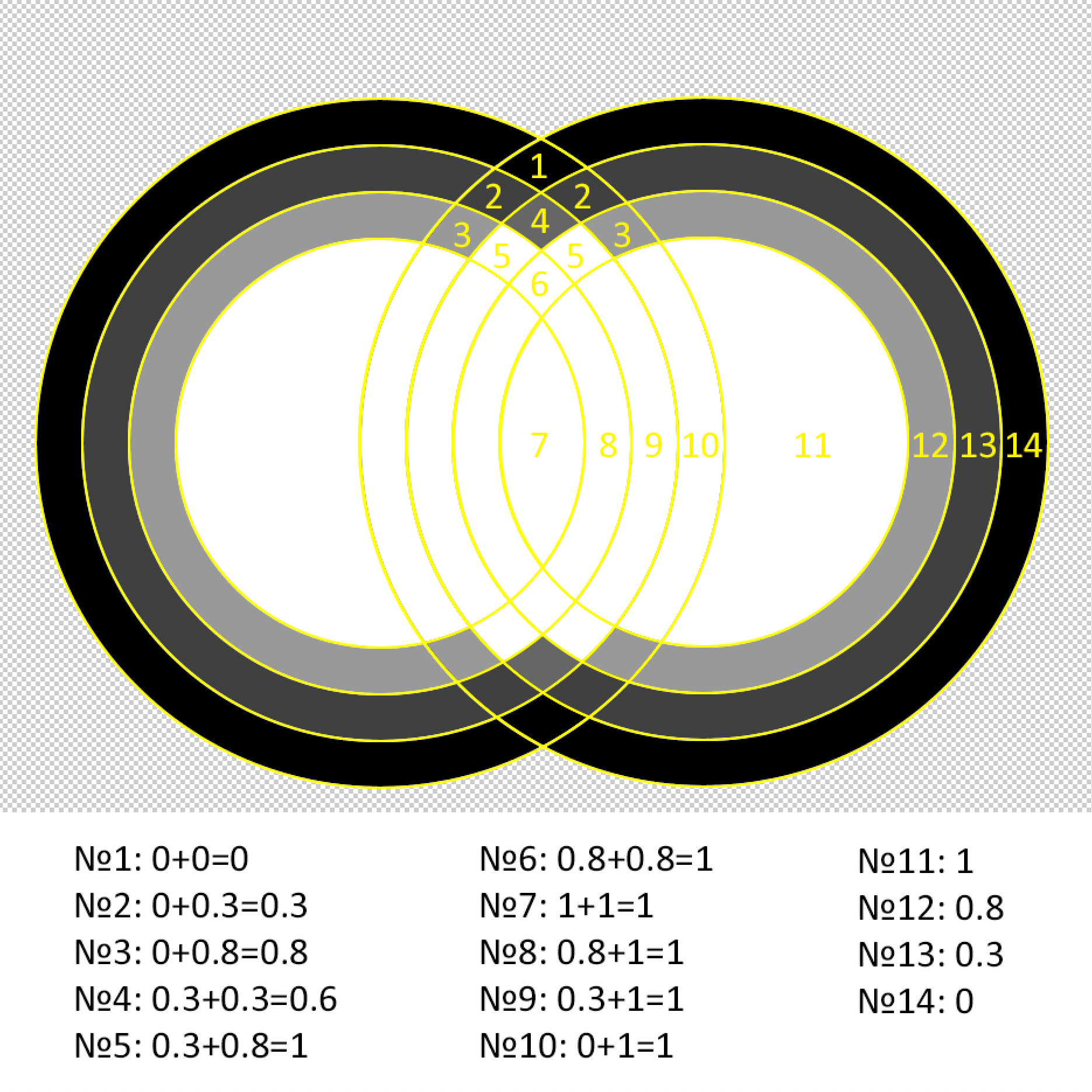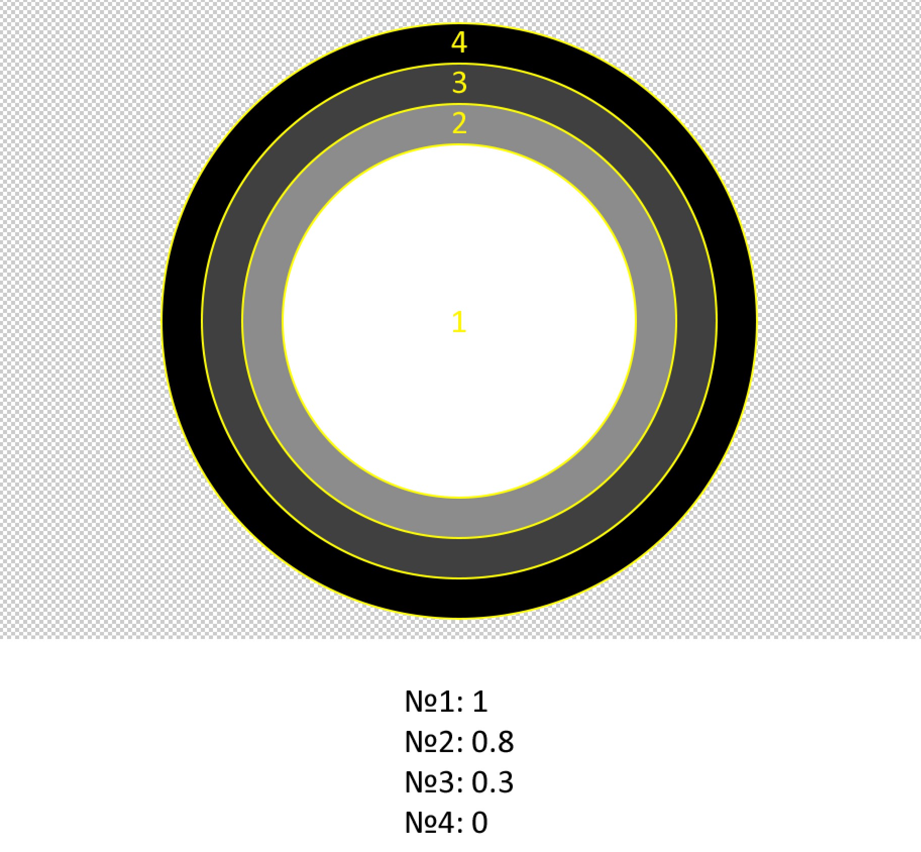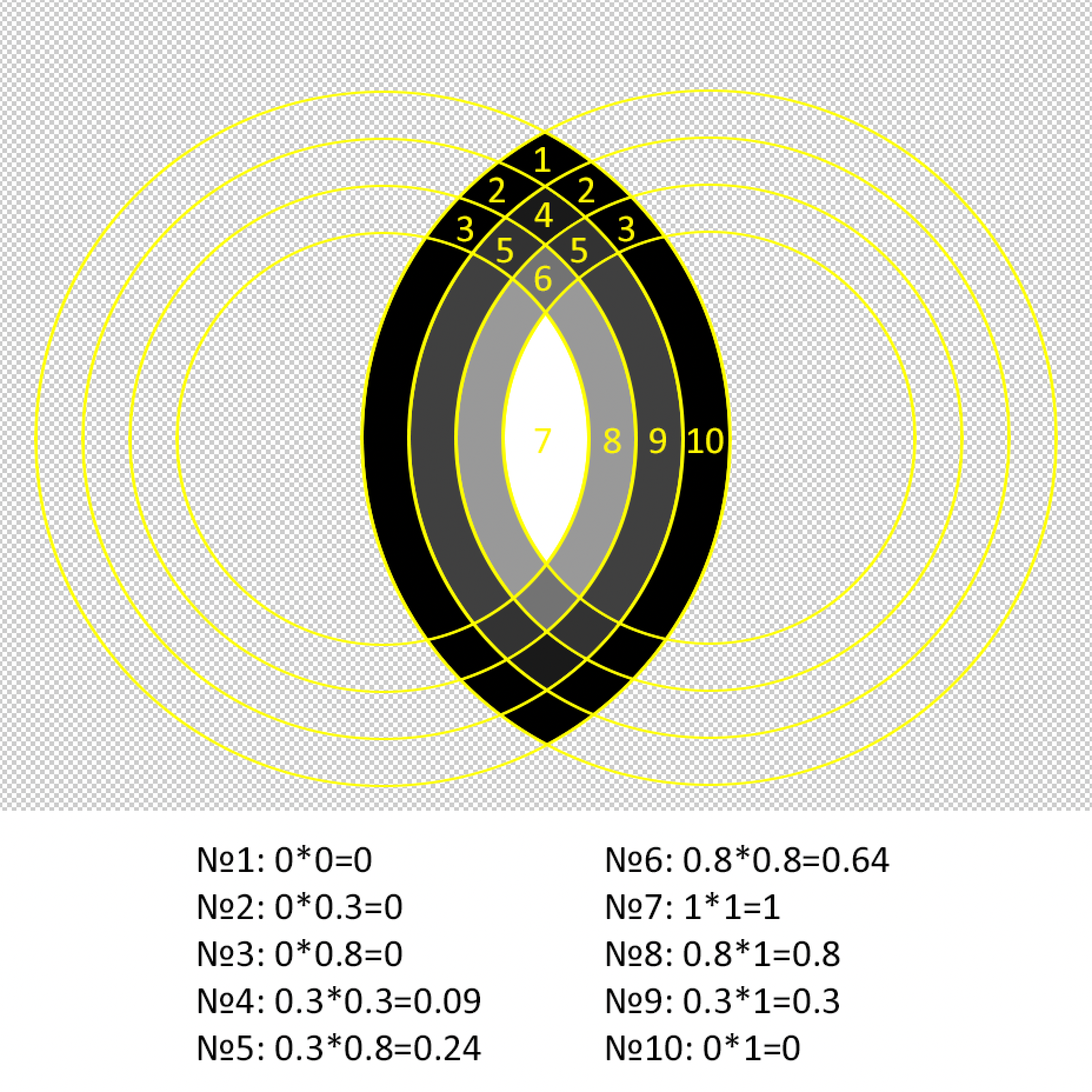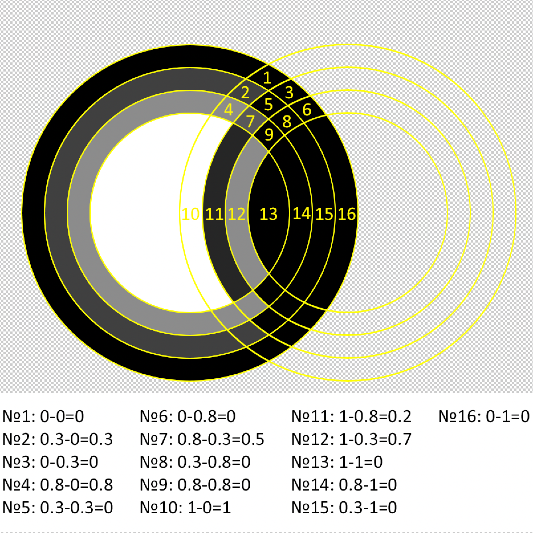 В левом столбце рассмотрим теоретический пример совмещения двух одинаковых масок, используя окружности в градациях серого. Каждая окружность представляет собой черное кольцо, внутри которого находится темно-серое кольцо меньшего размера, затем светло-серое кольцо еще меньшего размера, и наконец, центральный круг белого цвета. Для наглядности мы выделим границы между кольцами желтым цветом. Каждому цвету присвоим свое числовое значение в рамках диапазона градаций серого [0;1].