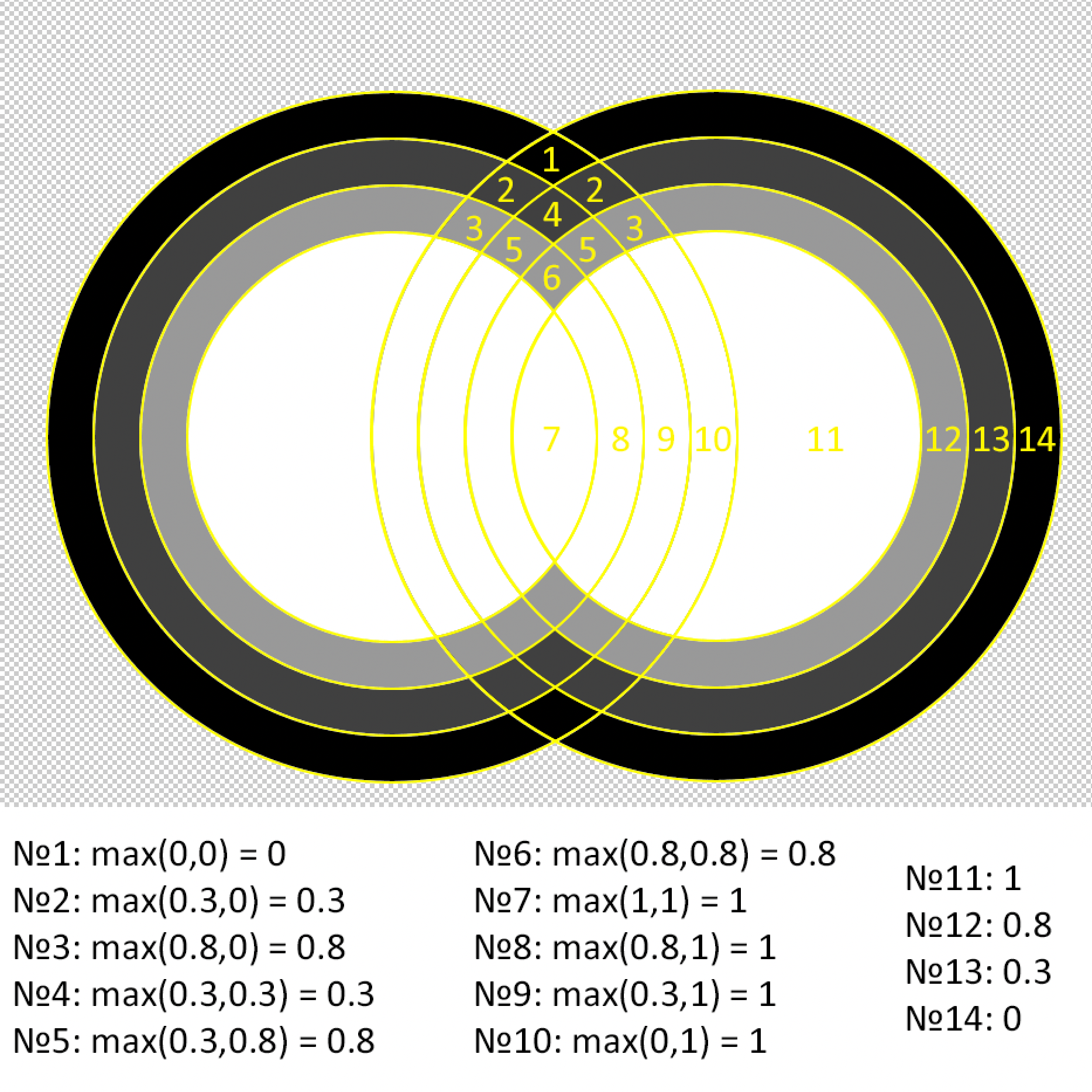 — цветовые значения масок складываются. Если результат сложения в конкретном пикселе больше 1, в итоговой маске будет ровно 1.