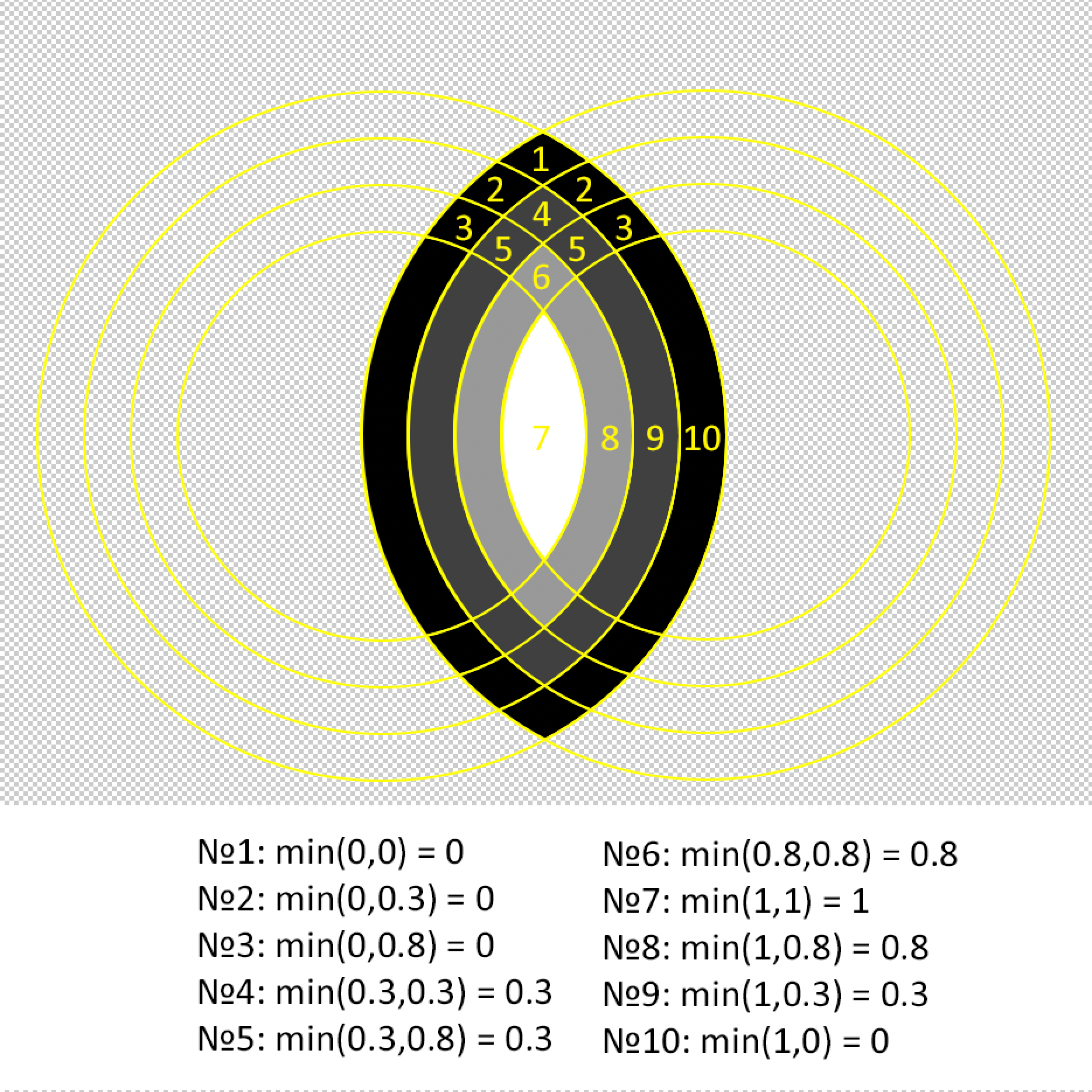 — цветовое значение каждого пикселя одной маски умножается на значение того же пикселя другой маски. Цветовое значение высчитывается в градациях серого, исходя из диапазона [0;1].