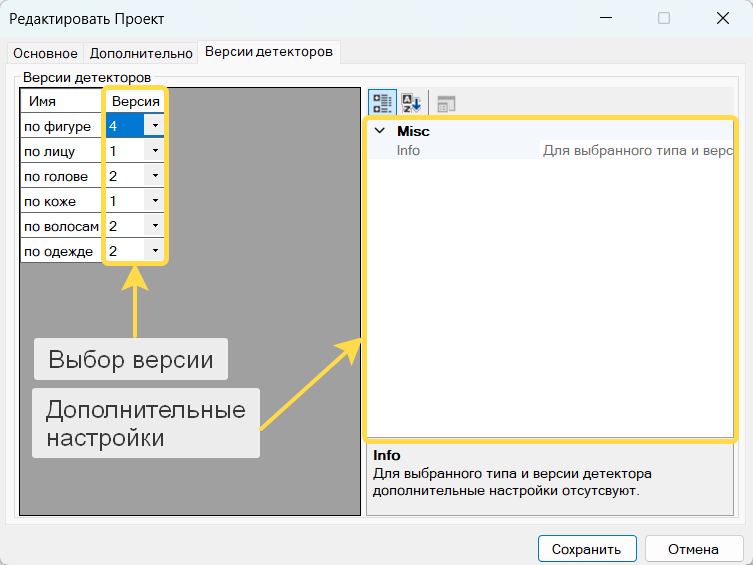 На вкладке можно выбрать версии детекторов, которые будут использоваться в проекте, а также задать дополнительные настройки для выбранного детектора.