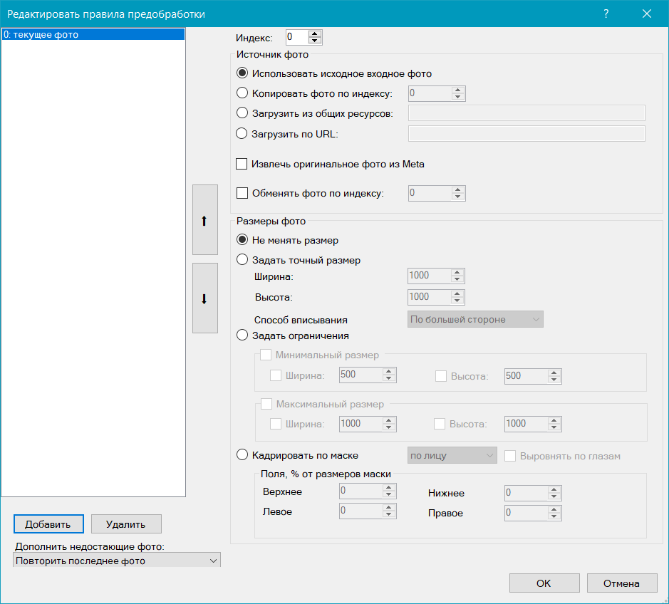 - В правиле с индексом 0 в качестве источника фото выбрать и установить значение индекса вспомогательного правила из п.1 (напр. 1). В этом же правиле установить галочку .