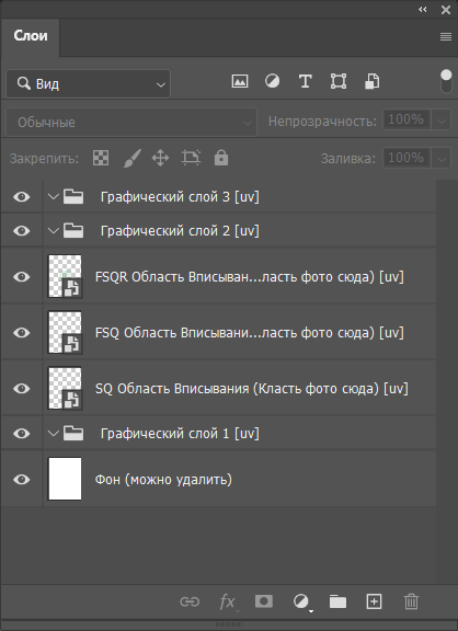 Элементы, составляющие структуру шаблона должны быть вам знакомы - это подгруппы графических слоев, смарт-объекты FSQR <название>, FSQ <название>, SQ <название>. Поскольку мы создаем шаблон с универсальной ориентацией, все элементы располагаются на верхнем уровне слоев в PSD-документе.
