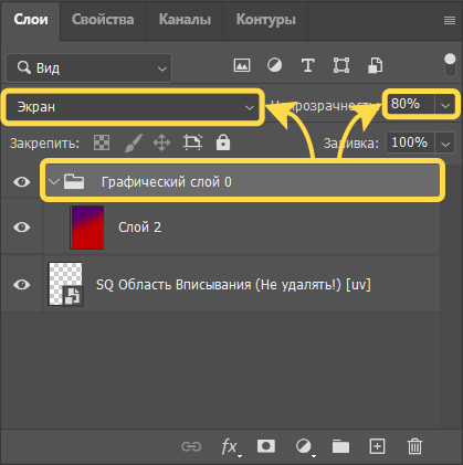 Для подгруппы графического слоя установим блендинг Экран и - .