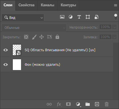 Элементы, составляющие структуру шаблона должны быть вам знакомы - это специальный смарт-объект SQ Область вписывания и слой Фон.