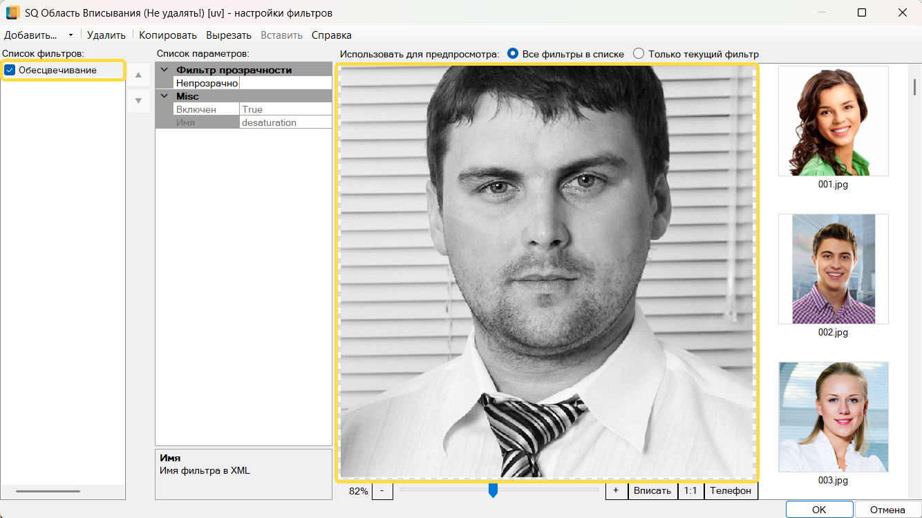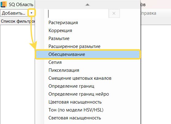 В диалоге настройки фильтров сначала добавьте фильтр Обесцвечивание, для этого в верхней панели меню нажмите кнопку , расположенную справа от кнопки , и выберите нужный фильтр в списке.