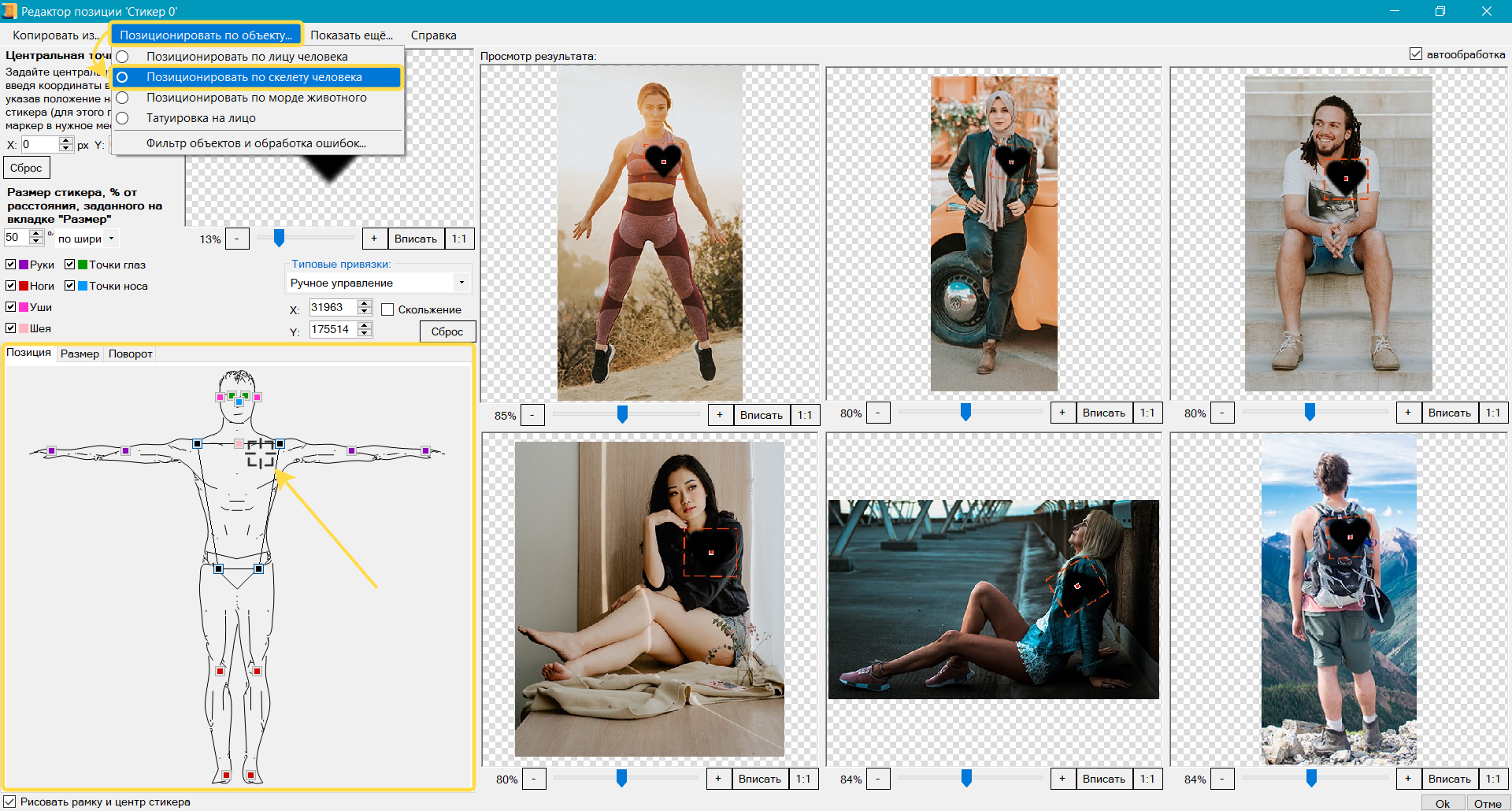 Спозиционируем стикер на груди слева. Выберем в меню .