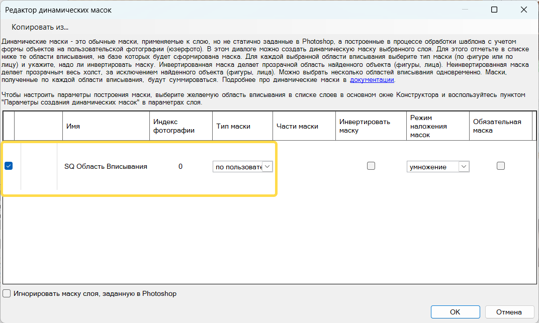 Для создания копии источника нажмите на область слева от галочки выбора SQ Область вписывания. После этого станет активна дополнительная панель для работы с источниками масок. Нажмите кнопку для создания копии источника, в нашем случае будет создана копия SQ Область вписывания.