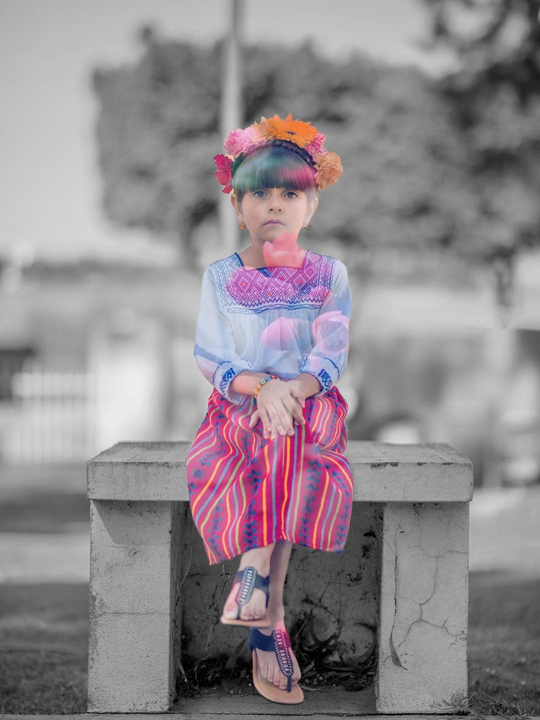 Цель — получить изображение, на котором фон оригинальной фотографии будет обесцвечен, пользовательская фигура останется цветной, а поверх неё будет наложен графический слой с цветами.