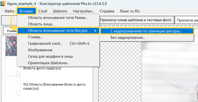 В Конструкторе шаблонов добавим еще одну область вписывания — FSQR (с кадрированием по границами фигуры).