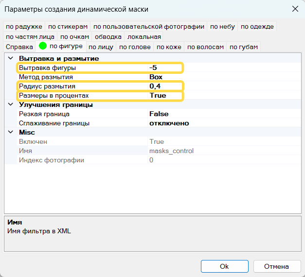 При работе с маской по пользовательской фотографии изменение параметров и может привести к нежелательным результатам.