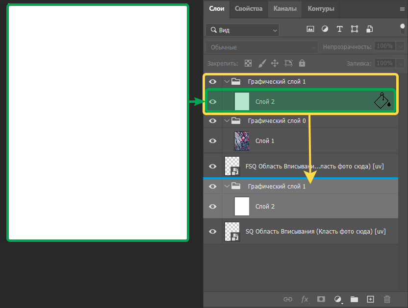 Далее, расположим группу Графический слой 1 между имеющимися областями вписывания FSQ и SQ.