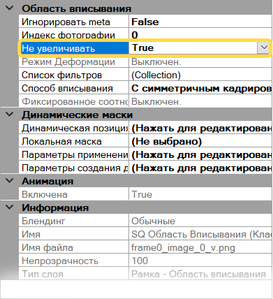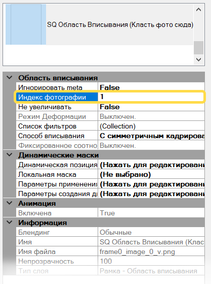 Для этого необходимо выбрать область вписывания с нужным индексом фотографии и установить для нее значение параметра = .