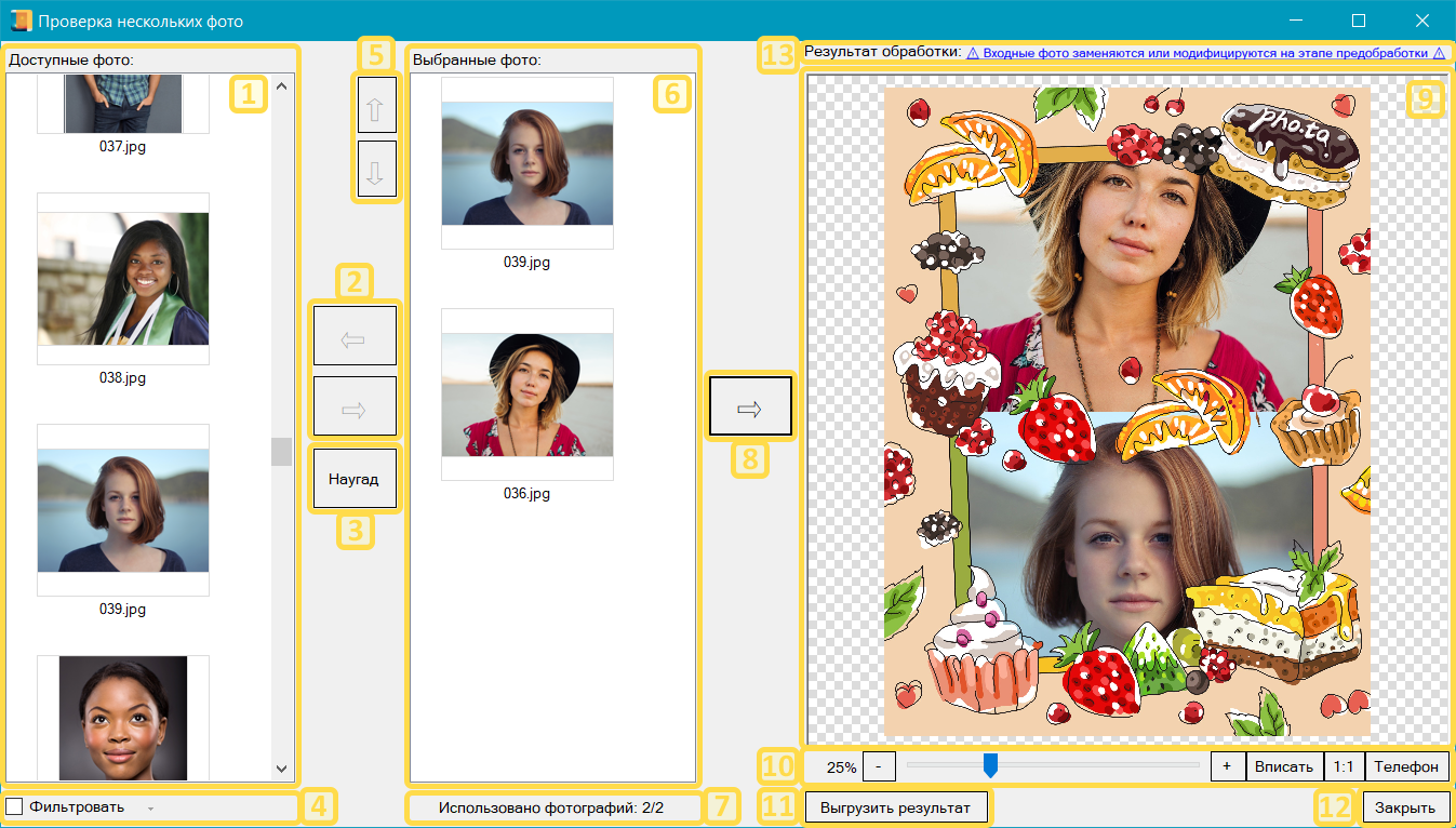 | 12 | Кнопка | Закрывает окно проверки нескольких фото. |