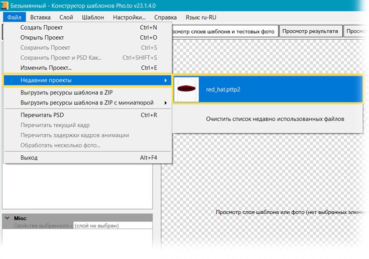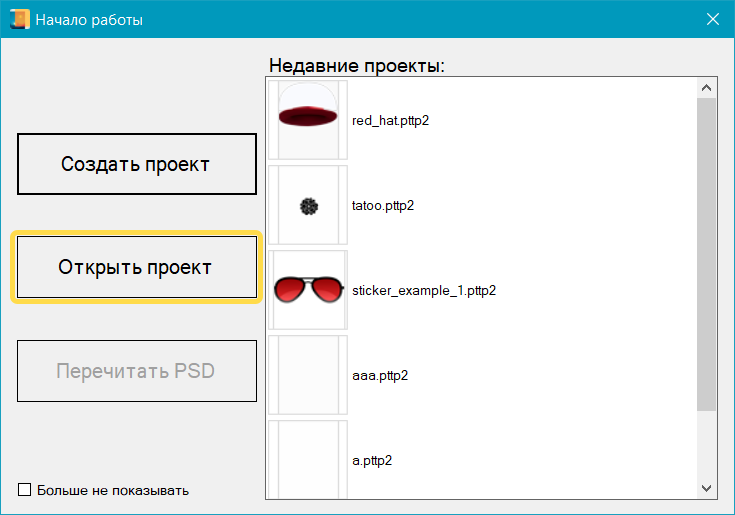 Нажмите , чтобы открыть проект, не привязывая к нему PSD-файл. Эта опция доступна, только если проект содержит графику, полученную при перечитывании PSD. Вы сможете тестировать шаблон на юзерфото, но не сможете вносить изменения в графику шаблона.