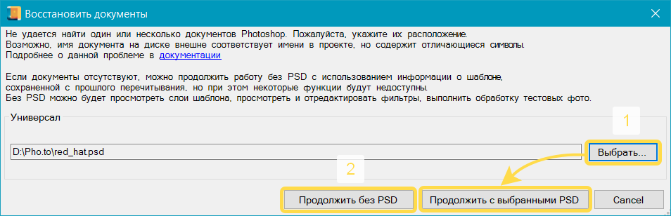 Если PSD-файл не найден, есть два варианта открытия проекта: