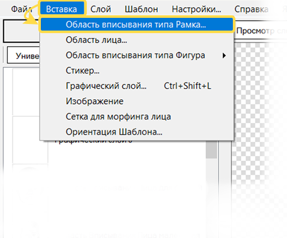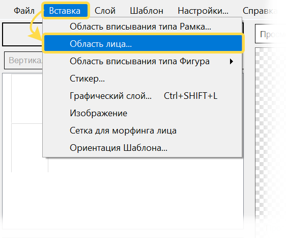 Область вписывания лица автоматически создается Конструктором шаблонов при создании шаблона типа Лицо. Или может быть добавлена к шаблону любого типа через меню .